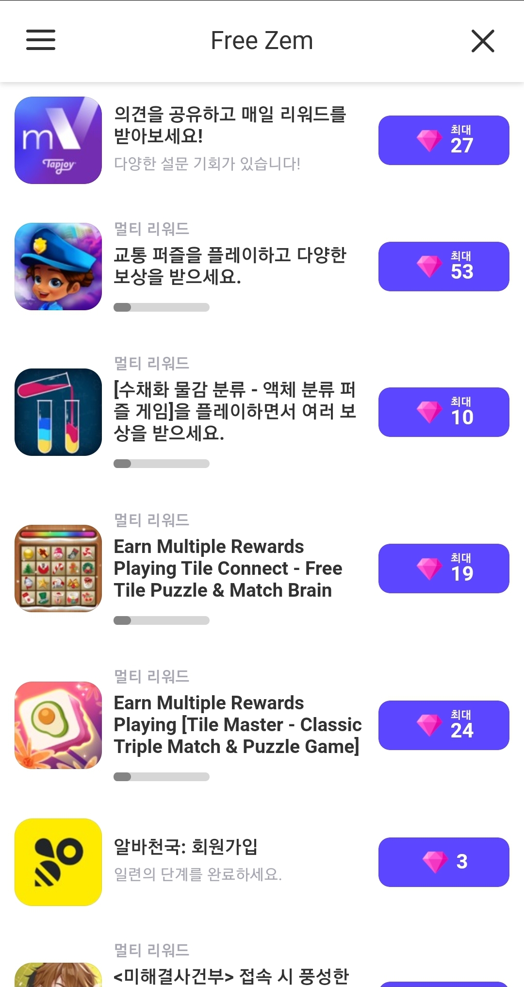 설문 조사를 하거나, 어플리케이션을 설치하거나, 회원가입을 하면 젬이 보상으로 주어집니다.