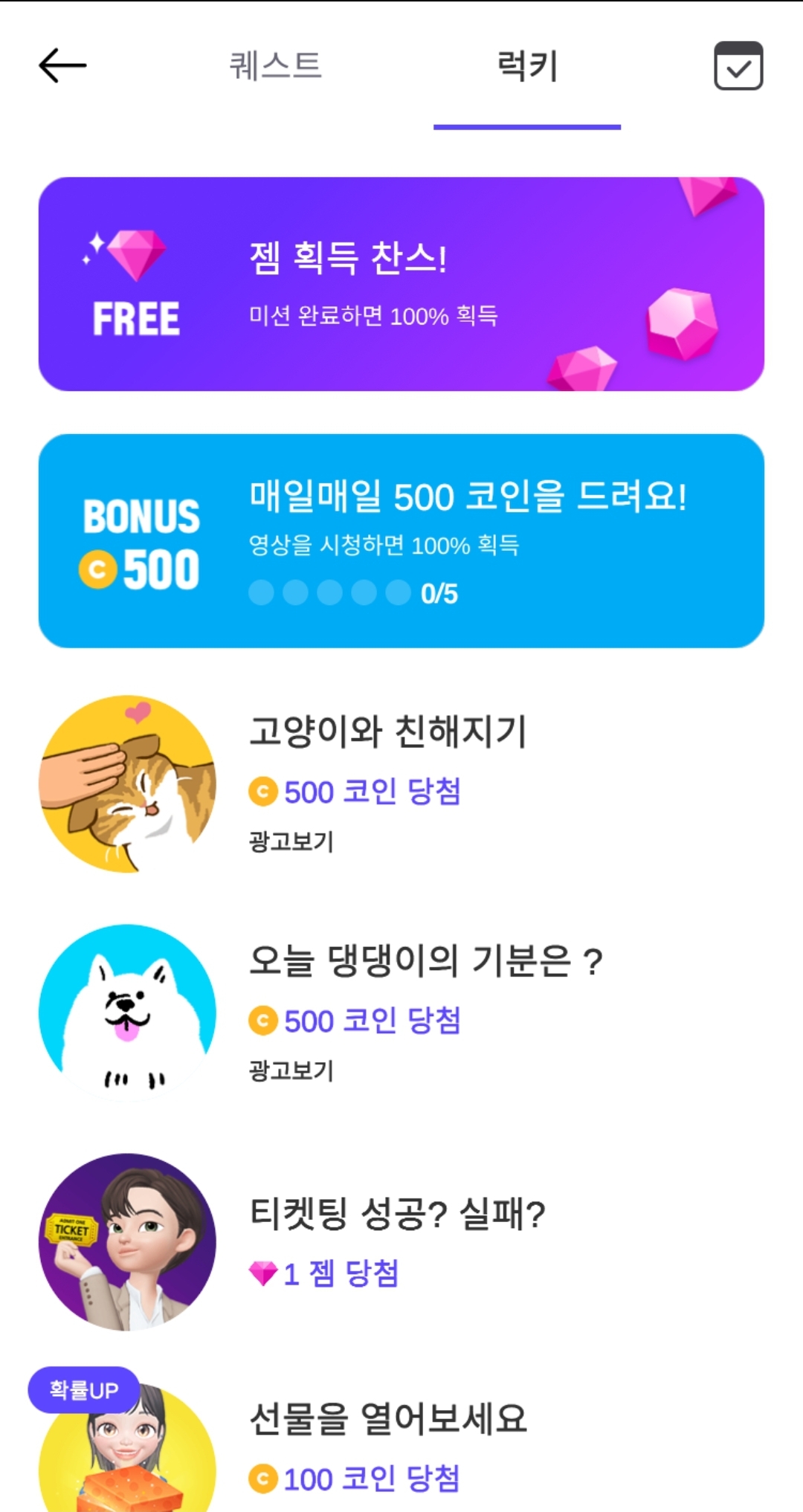 저희가 젬을 무료로 가장 쉽게 얻을 수 있는 방법이죠.
