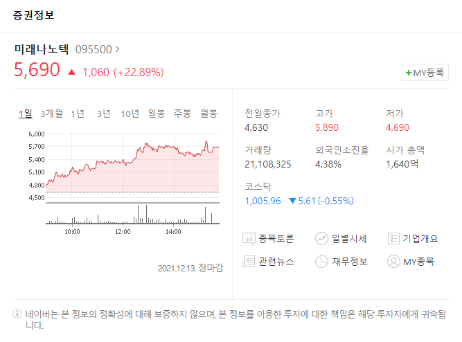 미래나노텍은 코스닥시장에서 전 거래일 대비 1천60원(22.89%) 급등한 5천690원에 거래를 마감했습니다.