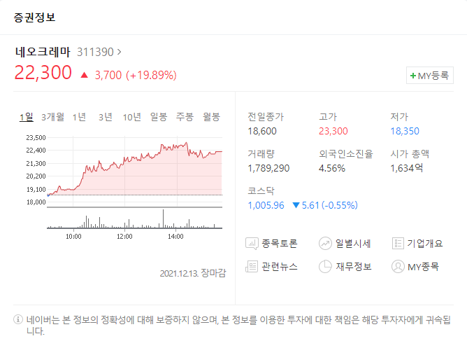 네오크레마는 코스닥시장에서 전 거래일 대비 3천700원(19.89%) 급등한 2만2천300원에 거래를 마감했습니다.