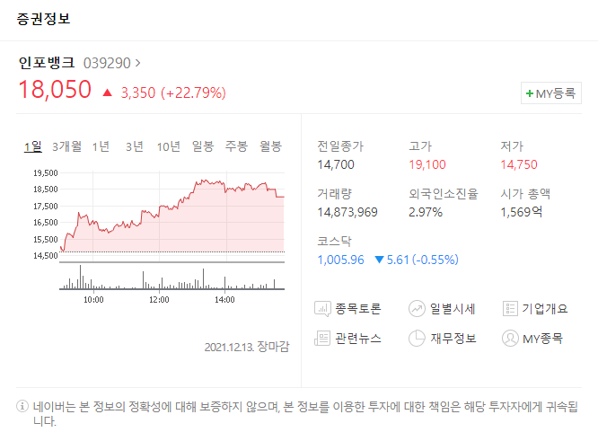 인포뱅크는 코스닥시장에서 3천350원(22.79%) 급등한 1만8천50원에 거래를 마감했습니다.
