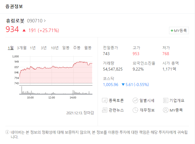 휴림로봇은 코스닥시장에서 전 거래일 대비 191원(25.71%) 급등한 934원에 거래를 마감했습니다.