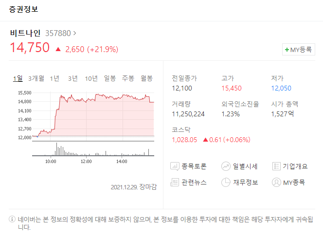 비트나인은 코스닥시장에서 전 거래일 대비 2천650원(21.90%) 급등한 1만4천750원에 거래를 마감했습니다.
