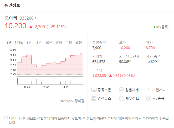 모아텍은 코스닥시장에서 전 거래일 대비 2천300원(29.11%) 급등한 1만200원에 거래를 마감했습니다.