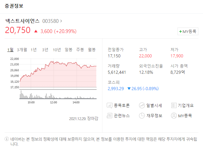 넥스트사이언스는 코스피시장에서 전 거래일 대비 3천600원(20.99%) 급등한 2만750원에 거래를 마감했습니다.