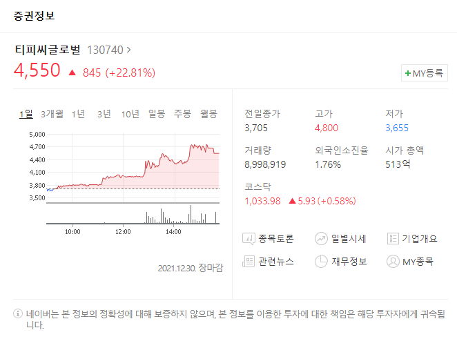 티피씨글로벌은 코스닥시장에서 전 거래일 대비 845원(22.81%) 급등한 4천550원에 거래를 마감했습니다.