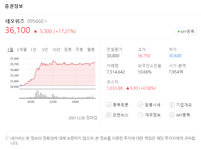 네오위즈는 코스피시장에서 전 거래일 대비 5천300원(17.21%) 급등한 3만6천100원에 거래를 마감했습니다.