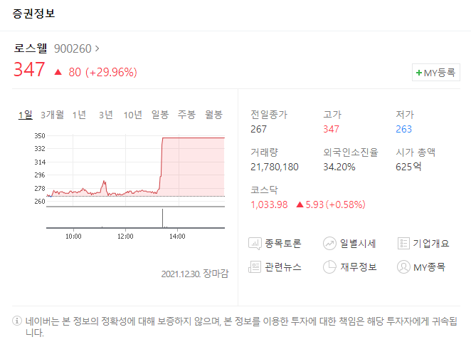 로스웰은 코스닥시장에서 전 거래일 대비 80원(29.96%) 급등한 347원에 거래를 마감했습니다.
