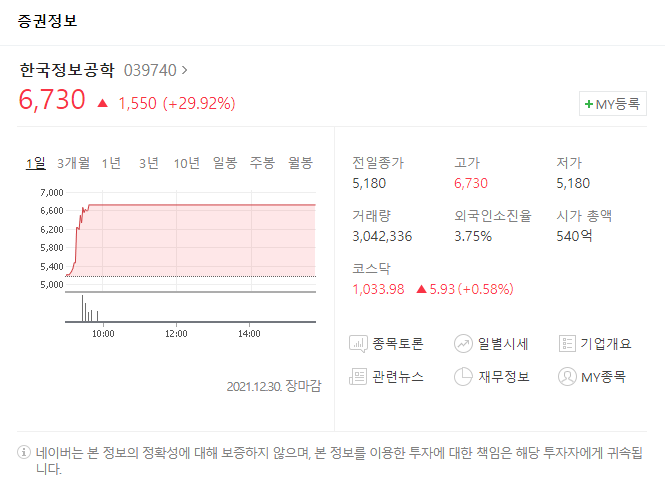 한국정보공학은 코스닥시장에서 전 거래일 대비 1천550원(29.92%) 급등한 6천730원에 거래를 마감했습니다.