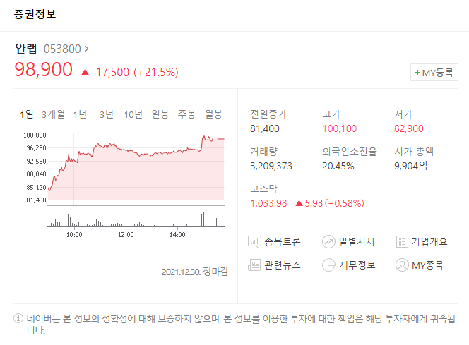 안랩은 코스닥시장에서 전 거래일 대비 1만7천500원(21.50%) 급등한 9만8천900원에 거래를 마감했습니다.