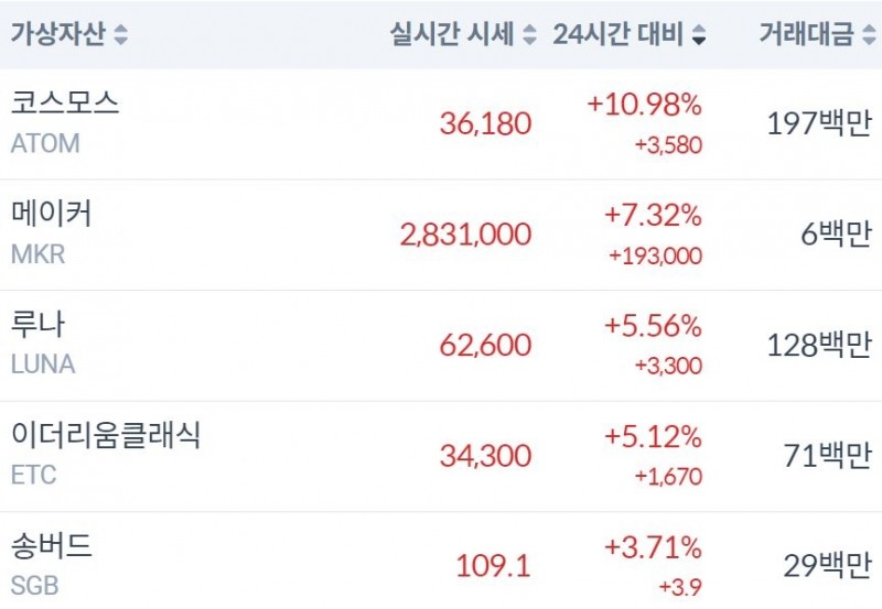 코스모스, 메이커, 루나, 이더리움클래식, 송버드 순으로 급등하고 있습니다.