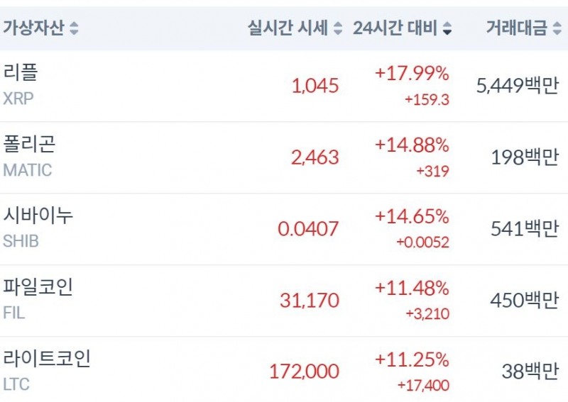 뒤이어 폴리곤, 시바이누, 파일코인, 라이트코인 순으로 급등하고 있습니다.