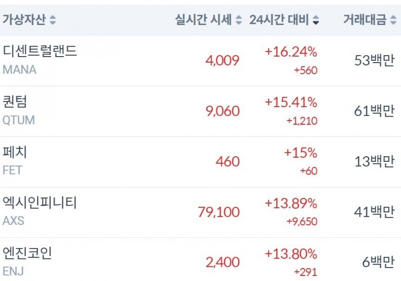 2022년 2월 16일 오전 11시 기준 코빗 원화마켓에서는 디센트럴랜드, 퀀텀, 페치, 엑시인피니티, 엔진코인 순으로 급등하고 있습니다.